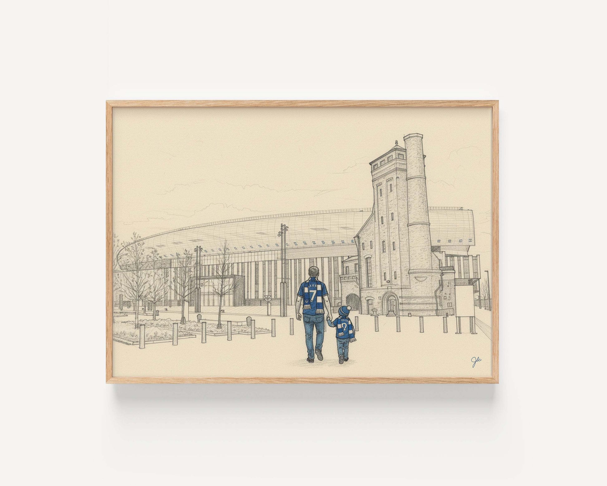 Expertly illustrated and printed on high quality matte fine art paper, every detail - from the modern riverside design to the father and child in Everton blue - celebrates the unbreakable bond between club, family, and city.