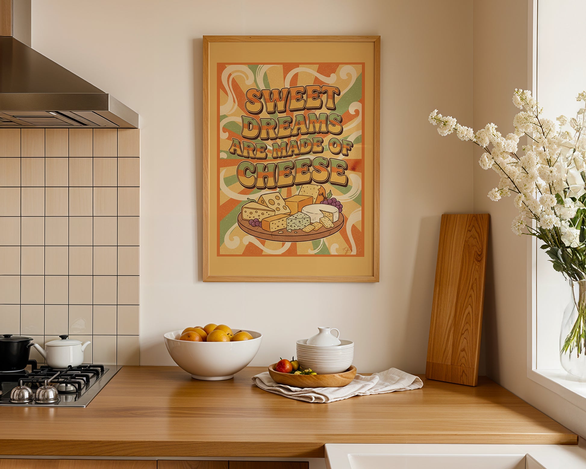 This unique print is part of Striped Circle's "Music x Food" Collection - a range of music-inspired prints in a retro 1970's style designed to add humour, warmth and colour to your kitchen wall (or any other room!)
